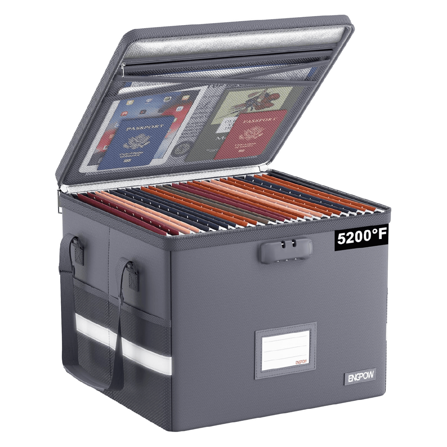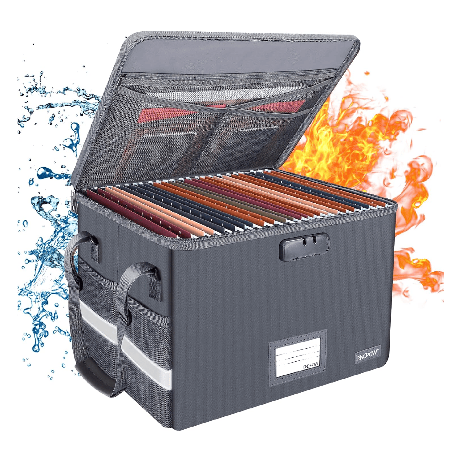 The ENGPOW Fireproof & Water‑Resistant Collapsible Document Box with Lock is a multi‑layer secure storage solution designed to protect and organize your most important paperwork and valuables. Made with double‑layer non‑itchy silicone‑coated fiberglass that helps resist high heat (up to ~2000 °F), this collapsible document box offers extra time to safeguard contents during fire, flood or wet weather. Featuring internal mesh pockets, card and USB pockets, and a roomy main compartment, it lets you neatly sort passports, certificates, cash, cards, USB drive, legal & letter size files and other valuables for easy retrieval. The secure combination lock and sturdy handle make it portable and reliable for home, office, office cabinet or travel “grab‑and‑go” use, while the compact collapsible design saves space when not in use. Whether you’re organizing files, storing certificates, or preparing an emergency kit, this fireproof box brings order and added peace of mind to your most important documents.